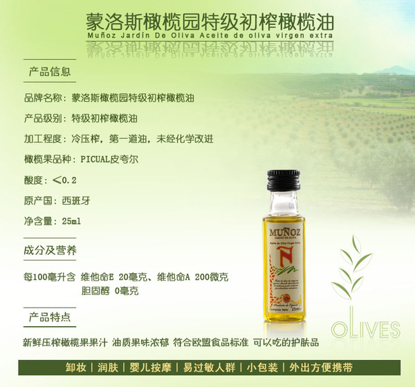 西班牙MUNOZ 特级初榨橄榄油是采用24小时内冷榨方式,保留最自然的橄榄油汁,品质优良。食用可以降低血脂粘度,排除身体毒素;美容可以减少孕妇的妊娠纹,可以滋润皮肤,肌肤更加娇嫩。婴儿食用可以保护皮肤不被尿液浸红。