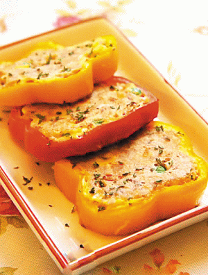 5.锅中放少许橄榄油,再放入彩椒圈,再往彩椒圈中填入蔬菜和吞拿鱼。