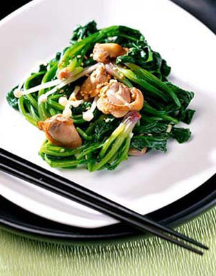 营养学家和动画片《大力水手》里的波波埃有什么共同点?他们都喜欢菠菜!菠菜富含纤维素、钙和人体每天所需的β-胡萝卜素。β-胡萝卜素对免疫系统、视力和腕屈肌至关重要。如果你受不了直接食用,《轻松饮食》的作者凯瑟琳·托曼吉建议你把菠菜卷到面饼里、做成什锦或者烧汤。