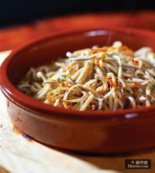 来自西班牙北部海域Pais Basco的野生鳗鱼苗是西班牙人餐桌上最受欢迎的昂贵菜式。一般来说,除了圣诞节这样隆重的节日,即使当地富豪也不会经常舍得消费此款美味,除非招待特别重要的客人或朋友。第一次在庄源吃鳗鱼苗的感觉,很难形容,但是一口就吞下几十条鳗鱼肯定是非常壮观的,作为西餐里的珍品食材,鳗鱼苗绝对是当之无愧的,那股清淡的甜味和细软的口感让人一吃难忘。吃的时候一定要用上专门搭配的木叉子,听说这是一项流传百余年的饮食传统。